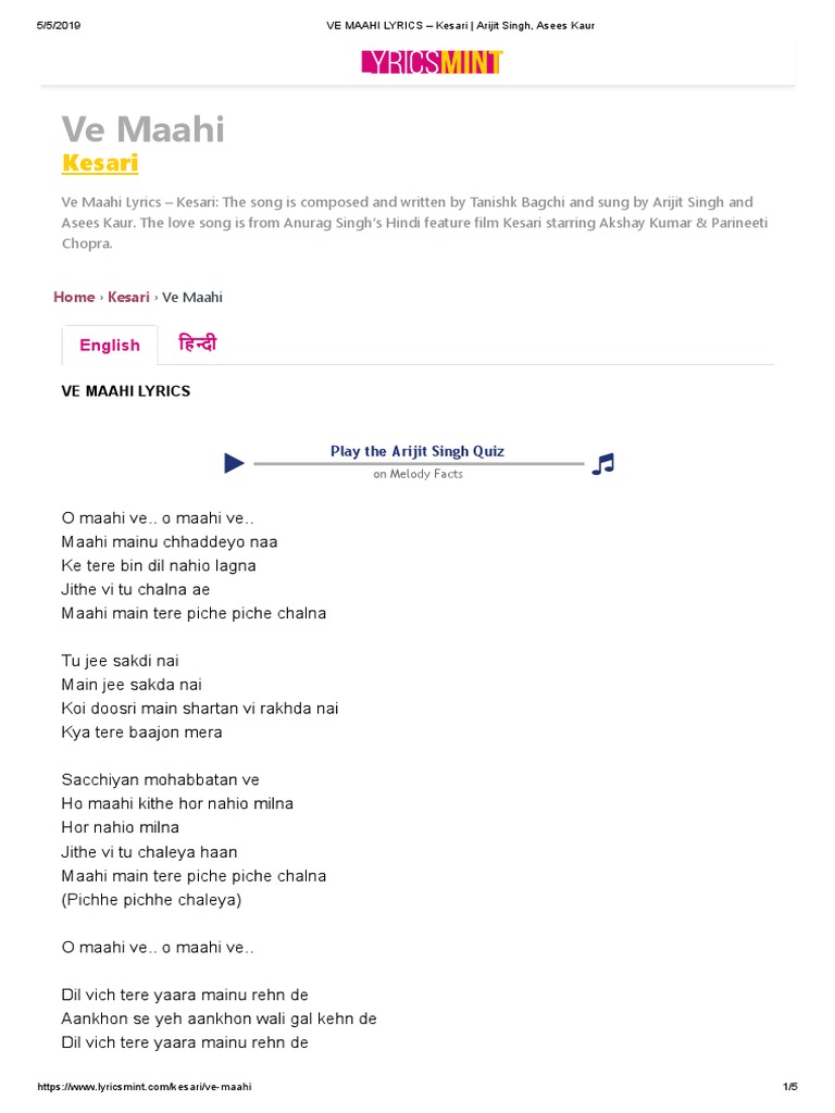 Kesari Song Lyrics In Hindi / The song is writing and music composed by tanishk bagchi.